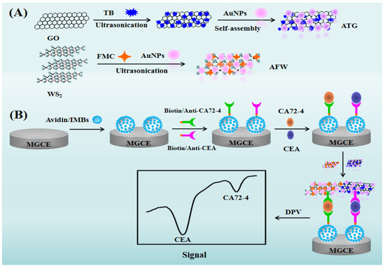 (A) Schematic representation of the synthesis of the ATG nanocomposite and AFW nanocomposite. (B) Schematic illustration of the electrochemical immunosensor for the simultaneous detection of CEA and CA72-4.