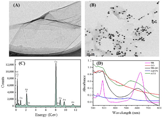 TEM images of (A) TB-GO, (B) AuNPs-TB-GO. (C) EDX spectrum of AuNPs-TB-GO composite. (D) UV-vis spectra of TB (pink line), GO (red line), TB-GO (black line), Au NPs (blue line), ATG (green line).