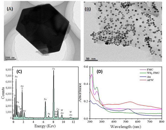 TEM images of (A) bulk WS2, (B) AFW nanocomposite. (C) EDX spectrum of AFW. (D) UV-vis spectra of FMC (pink line), WS2-FMC (green line), Au (blue line), AFW (red line).