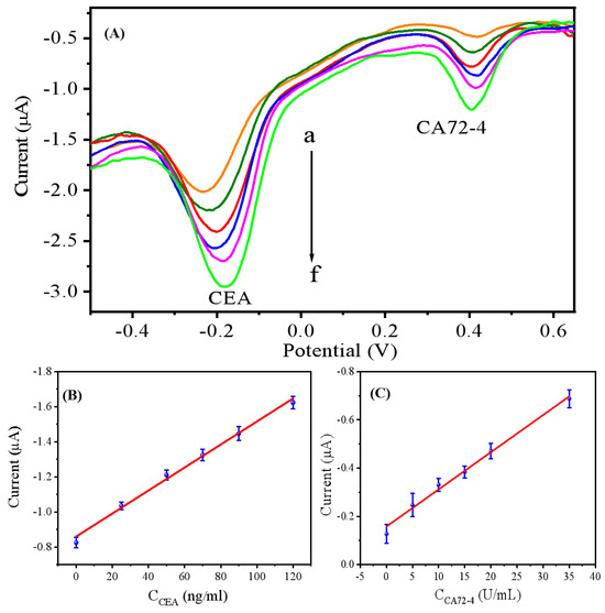 In Figure 4B, the changes in the electron transfer resistance (Ret) on different modified electrode surfaces were detected by electrochemical impedance spectroscopy when the bare MGCE, IMBs/MGCE, CEA-Ab1&CA72-4-Ab1//IMBs/MGCE, CEA-Ag&CA72-4Ag/Ab1/IMBs/MGCE, and ATG-CEA-Ab2&AFW-CA72-4-Ab2/CEA-Ag &CA72-4-Ag/CEA-Ab1&CA72-4-Ab1/IMBs/MGCE were placed in a 0.1 M KCl solution containing 10 mM Fe(CN)64−/3−. The result indicated that due to the semiconducting property of the immunomagnetic beads (IMBs) and the biotin on the magnetic bead surface, it could hinder electron transfer, resulting in a larger Ret of IMBs/MGCE (curve b) than that of the bare MGCE (curve a). When the biotinylated CEA-Ab1 and CA72-4-Ab1 mixture is immobilized onto the MGCE surface by affinity, the resistance significantly increases (curve c), due to the fact that antibodies are large biomolecules that also hinder electron transfer. Similarly, when the mixture of CEA and CA72-4 antigens is further incubated on the electrode, the resulting immunocomplex further hinders electron transfer, leading to a further increase in Ret (curve d). Nevertheless, when the nanoprobes ATG-CEA-Ab2 and AFW-CA72-4-Ab2 are specifically bound to the CEA and CA72-4 antigens immobilized on the electrode surface, Ret decreases after immunoreaction (curve e), which is consistent with the results of cyclic voltammetry. Based on the CV and EIS results, it is proved that the assembly of IMBs, Ab1, Ag, and Ab2 on the electrode surface has been achieved through affinity interactions and specific immune reactions; meanwhile, the biological activity of the CEA&CA72-4 primary antibody immobilized on IMBs/MGCE was effectively maintained. As a result, a dual-component CEA and CA72-4 detection immunosensor has been successfully constructed.