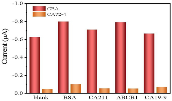 The prepared immune electrode was immersed in a mixture of 25 ng/mL CEA and 10 U/mL CA72-4, and its electrochemical response signal was detected six times. The standard deviations of six measurements of CEA and CA724 were 3.3% and 3.9%, respectively. Additionally, six immune electrodes were used to detect the same mixed sample, resulting in standard deviations of CEA and CA724 of 3.6% and 6.6%, respectively. Furthermore, after storing the prepared immune sensor at 4 °C for 30 days, the magnitudes of the electrical signals of CEA and CA72-4 measured could still maintain 91% and 89% of the initial current, indicating excellent long-term stability of this immune sensor.