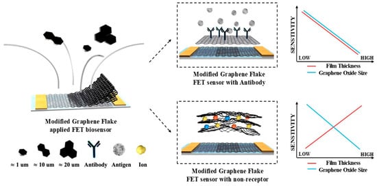 Target substances requiring receptors, such as PACAP38, exhibit improved performance as the size of the graphene flakes decreases. Conversely, for substances such as ions that can be measured without receptors, variations in the ratio of functional groups due to changes in the graphene flake size allow us to elucidate the principles of ion detection and the ease of biomaterial detection.