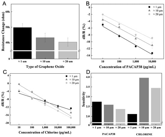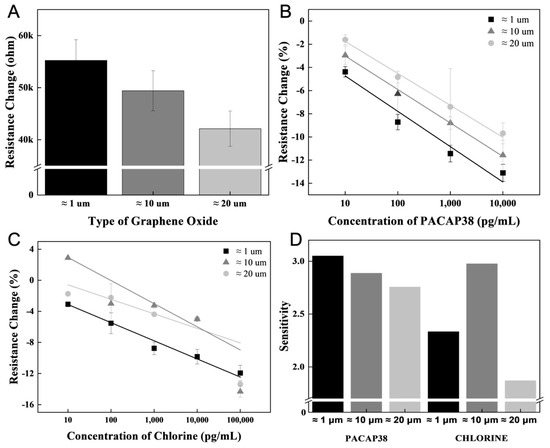 PACAP38 and chlorine detection using a controlled GO flake. (A) Resistance changes according to receptor immobilization depending on the GO flake size. (B) PACAP38 detection in the concentration range of 10 pg/mL~10 ng/mL for GO flakes of different sizes. (C) Linear slope of chlorine detection within a certain concentration range. (D) PACAP38 and chlorine detection slope of the linear function analysis with ≈1, ≈10, and ≈20 μm size of GO flakes.