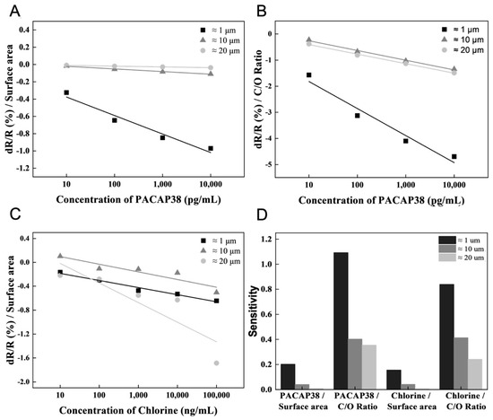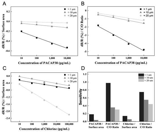 To analyze the sensitivity according to the graphene flake size, the results of the biosensor deposited 30 times were analyzed in the same manner as shown in Figure 4. The analysis of the PACAP38 detection results by surface area and C/O ratio is shown in Figure 6A,B. The chlorine detection analysis was based on the surface area (Figure 6C). In addition, the biosensor sensitivity according to flake size and deposition conditions was analyzed by comparing the slopes of the graphs (Figure 6D).