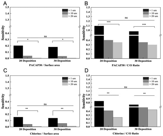 Analysis of the effect of the graphene C/O ratio or surface area through sensitivity derived from the measured values of PACAP38 and chlorine measured in 20 and 30 depositions condition sensors implemented using graphene flakes of sizes ≈1, ≈10, and ≈20 μm. The p-values based on the number of depositions and flake sizes were determined using t-tests and are represented as follows: *** p ≤ 0.001, ** p ≤ 0.01, * p ≤ 0.05, and ns (not significant) for p > 0.05. (A,B) Analysis of the sensitivity values obtained by measuring PACAP38 in 20 and 30 deposition sensors as surface area and C/O ratio. (C,D) Sensitivity values obtained by measuring chlorine as surface area and C/O ratio analyzed by value.