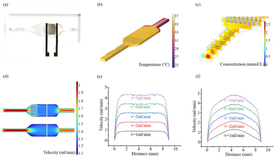 In order to better detect the invasion ability of Hela cells, it is necessary to continuously optimize the design of microfluidic chips. Figure 2a and Figure A5 show the schematic diagram of the microfluidic chip designed by us. Two groups of bending structures are designed at the entrance of the channel, the main function is to mix the solution and make the fluid concentration more uniform so as not to affect the subsequent impedance measurement. In the middle of the channel is a microcolumn array, which is used to keep the flow rate in the detection area stable. In order to maintain the invasion environment temperature of Hela cells, we passed a 37 °C culture medium, and the external temperature was 28 °C. Figure 2b simulates the overall heat loss of the chip, and the temperature of the detection area can be kept above 35 °C, which is suitable for the growth of Hela cells and close to the human body temperature. In Figure 2c, we simulated the mixing effect of the bending structure. The bending structure has a good mixing effect from the obvious concentration difference in the fluid cross section at the entrance to almost no concentration difference in the fluid cross section after passing the bending structure. Figure 2d is the simulation effect diagram of liquid flow rate control with or without micro-column array in the middle of the channel, and the white area in the figure is the selection point of the detection area in Figure 2e,f. We compared the changes in flow velocity in the detection area with or without microcolumn array. Although the center flow velocity is closer to the input flow velocity without microcolumn array, the flow velocity from the center to both ends changes greatly and is not as stable as that with microcolumn array. However, the invasion of cancer cells is affected by the flow rate of the fluid, and the unstable flow rate will cause the invasion of cancer cells to be uneven, thus affecting the final detection effect. Therefore, the design of the microcolumn array can maintain a stable flow rate, so that the cancer cells are evenly invaded, so as to achieve the best detection results.