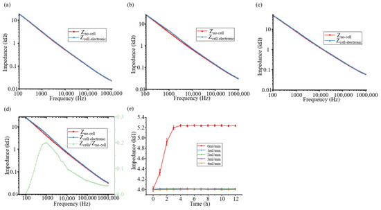 Zcells/Zno-cell is the ratio of cellular impedance to cell-free impedance and represents the resolution of impedance [19]. When Zcells/Zno-cell reaches the maximum and the fluctuation is small, the frequency currently f0 is selected as the cell sensitive frequency. The frequency of cell sensitivity depends on sample properties and electrode properties, including cell, medium, electrode conductivity, and detection voltage [20,21]. For specific samples and electrodes, selecting the appropriate cell sensitive frequency can obtain sensitive and stable results. Because of electrode polarization and electrical noise, inappropriate frequency will lead to inaccurate results. Usually, the sensitive frequency calculated from the first measurement is chosen as the measurement frequency of this experiment.