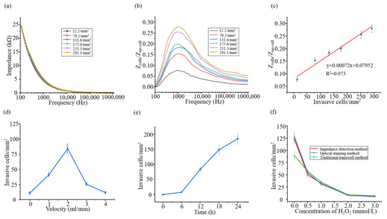 (a) Zcell-electronic impedance spectrum corresponding to different invasion capabilities. (b) Zcells/Zno-cell spectrum from 100 Hz to 1000 kHz corresponding to different invasion capabilities. (c) The corresponding relationship between Zcells/Zno-cell and the invasion ability of cancer cells at f0 = 1 kHz; (d) the changes in the invasion ability of cancer cells at different flow rates for 12 h; (e) the sequential changes in the invasion ability of cancer cells at 2 mL/min flow rates. (f) The effects of different concentrations of hydrogen peroxide on the invasion ability of Hela cells were evaluated by electrical impedance detection, optical staining, and the Transwell method.