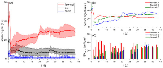 A reduced flow velocity (uinoc = 0.5 uexp) was applied during the inoculation to support bacterial attachment in the early stages of the experiment, resulting in an initially increased sensor signal compared to the reference value set for the clean sensors at uexp. On Day 2, the sensor signals dropped from increased values during inoculation, with a reduced flow rate for all of the different sensor applications. The sensor signals at Day 2 of the cultivation displayed values of 5–18 a.u. for the flow cell sensor, 6–10 a.u. for the SST sensor and 0–4 a.u. for the C-PP sensor. Large differences in signal development in the flow cells could be seen due to variation in the initial biofilm accumulation at the imaging area in the flow cell, as flow cell A (red) showed the highest biovolume accumulation at Day 2 (23 µm3/µm2), followed by flow cell C (green) with 8 µm3/µm2 and flow cell B (blue) with 3 µm3/µm2.