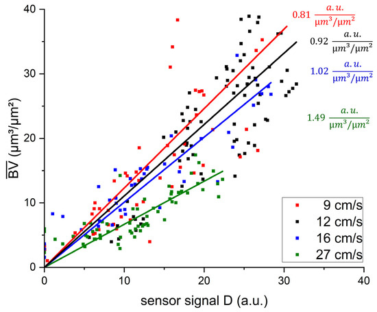 Figure 4 displays the correlation of the biofilm sensor signal with the biovolume quantified from OCT C-scans in the mesofluidic flow cells. For all of the investigated flow velocities, the correlation between accumulated biovolume and sensor signal can be described with a linear regression curve. The resulting inverse slope of the linear fit describes the sensitivity (µm