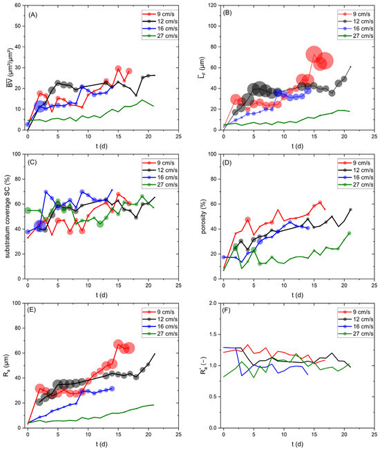 Supplementary Information (see Figures S1 and S2). At Day 14 of the cultivation, roughness values of 51 µm (9 cm/s), 43 µm (12 cm/s), 31 µm (16 cm/s) and 12 µm (27 cm/s) were measured.