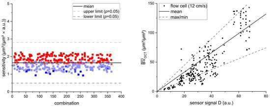 exp = 27 cm/s) performed as triplicates, the 14 datasets acquired from experiment 2 were randomly recombined in sets of three, as they were equal probable for the sensor measurement. For the resulting 364 combined datasets, the sensor sensitivity was calculated according to the linear correlation of the sensor signal with the mean biovolume.