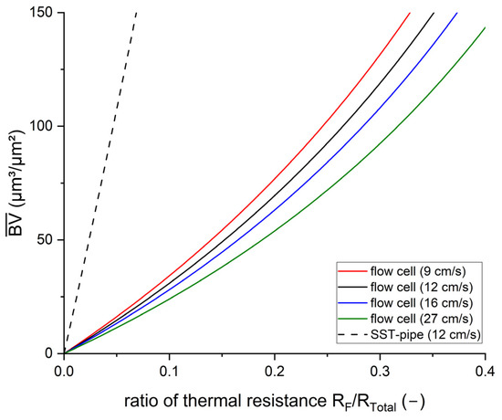 Figure 7 shows the development of the ratio of thermal resistance of the biofilm to the total thermal resistance for a biovolume of up to 150 µm