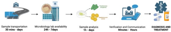 Performing analyses at the point of care expedites the diagnosis. Figure 1 highlights potential delays associated with performing analyses in central laboratories. The first delay occurs during sample transportation. Sending samples for analysis can take anywhere from half to an hour, if transported within the same hospital, to several days if sent from another point of care. The second delay involves the availability of microbiology labs. A recent study in Spain found that only 35% of hospitals had microbiology services available 24 h a day, 7 days a week [20]. In other hospitals, if the sample is not processed during the morning shift, analysis is delayed until the next day, and if requested on a Friday, it may not occur until Monday. Time is then required for sample preparation and analysis, followed by verification of results, all of which can also delay the information reaching healthcare providers.