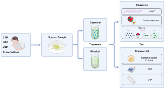 Sputum culture remains the primary method used in hospitals to identify the pathogen responsible for a LRTI. It is a viscoelastic solid and therefore needs to be liquefied before analysis. Liquefaction methods can be physical, chemical, or a combination of both. Physical methods usually involve dispersing samples, for example, using glass beads and stirring [55]. They are usually combined with a chemical method and will not be reviewed extensively here. The degree of liquefaction, the time required to complete the process, and the need to implement instrumentation or the potential denaturation of biomolecules are factors that must be considered when choosing a liquefaction method (Table 1).