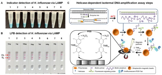Examples of NAAT for detecting respiratory pathogens in sputum. Sensitivity of the H. influenzae LAMP-LFB assay with gradient dilution of genomic DNA templates. Two different methods: (A) Colorimetric Indicator; (B) Biosensors. Template DNA concentrations for reactions were 10 ng, 1 ng, 100 pg, 10 pg, 1 pg, 100 fg, 10 fg, and 1 fg, respectively. Genomic DNA concentrations from 10 ng to 100 fg produced positive results. CL: Control Line; TL: Test Line. (C) Overview of the different steps in the aHDA-electrochemical-genomagnetic assay. LAMP: Loop-Mediated Isotermal Amplification. LFB: Lateral Flow Biosensors. Copyright permission from Springer Nature (A,B) and from Elsevier (C).