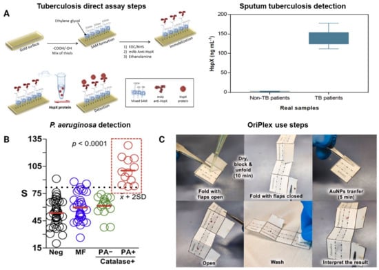 Immunoassays have also been used for detecting P. aeruginosa in sputum samples with high sensitivity and specificity in a collection of 104 human sputum specimens (Figure 4B) [62]. In this approach, nanoparticles coated with polyclonal antibodies against the pathogen were stored in paper-based reservoirs. Contact with a paper substrate containing a drop of dried liquefied sputum released the nanoparticles, which were able to identify the bacterial cells after 5 min incubation. Notably, sample liquefaction with the catalase-based approach only required adding the reagent to the sputum sample. No additional centrifugation, vortexing, or lysis step was performed. These features, along with the colorimetric signal transduction mechanism that enabled signal quantification with a smartphone app, make this approach useful for point-of-care diagnosis. Of note, in a follow-up work the simultaneous detection of several respiratory pathogens could be achieved by taking advantage of the folding capabilities of paper (Figure 4C) [98]. This enabled manufacturing an origami biosensor for the simultaneous detection of P. aeruginosa and K. pneumoniae with LODs of 3.4·103 CFU·mL−1 and 1.4·102 CFU·mL−1, respectively. The pathogens were also detected after spiking them into bronchial aspirate samples with a concentration of 105 cells·mL−1 or higher, thus proving the suitability of this approach for diagnosing LRTIs.