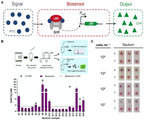 Recently, a new approach was introduced for detecting PYO that may solve the issue of non-specific interactions with antibodies. It consisted of using whole cells as bioreceptors and signal generators. The cells express a transcriptional regulator (BrlR) responding to PYO by producing green fluorescent protein (GFP) (Figure 5A) [107]. This generated a fluorescent signal that depended on the concentration of PYO with a LOD of 1.3 μM. Good recoveries were observed in real sputum samples. However, this approach is less well suited for diagnoses at the point of care, as it requires several pieces of large equipment that can only be found in central laboratories. This issue could be alleviated by using a cell-free expression system (Figure 5B) [108]. It was shown that a system responsive to the QS molecule 3-oxo-C12-HSL from P. aeruginosa could yield a dose-dependent response in the concentration range between 0.1 and 104 nM. When applied to sputum samples from cystic fibrosis patients the biosensors showed good correlation with analyses performed with liquid chromatography coupled to mass spectrometry (LC-MS/MS) after using an extraction method based on adding acidified ethyl acetate or dichloromethane followed by centrifugation. The authors also pointed out that transition to clinical diagnoses could be facilitated in the future by using freeze-dried reagents, on their own or embedded in paper discs.