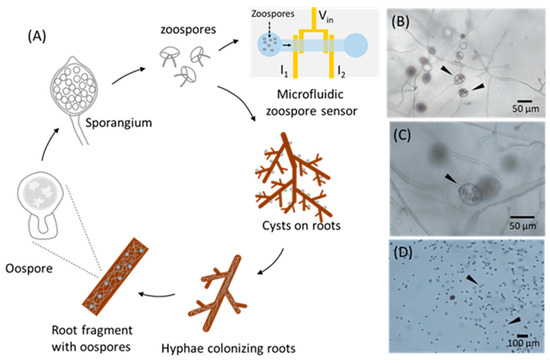 (A) Schematic illustration of life cycle of zoospores. (B–D) Optical microscope images of Phytophthora cactorum H78. (B) Mature sporangia harbouring zoospores (►). (C) Individual sporangium highlighting membrane-engaged zoospores prior to release (►). (D) Motile zoospores released from sporangia into water (►).