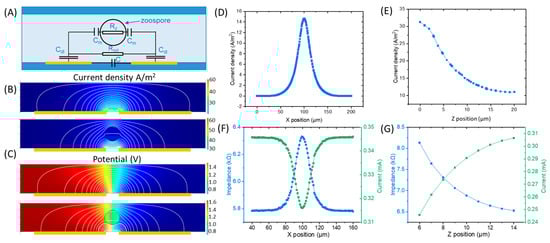 Figure 3 shows the finite element computation of the current flow (Figure 3B–E) at 50 kHz and impedance |Z| (Figure 3F,G) between the electrodes, with a model zoospore passing across the 10 µm gap between electrodes disposed at the base of a channel 20 µm high and 20 µm wide. Based on the COMSOL simulation, the highest current density appeared in the gap area between the paired electrodes along the X-axis (Figure 3D), while along the Z-axis (X-axis in the middle of the gap), the current density increased from the top to the bottom of the channel (Figure 3E). A more prominent change in the electrical signal would be triggered when zoospores are present in the areas with higher current densities. Therefore, a higher response would be triggered when zoospores are in the middle of the gap (Figure 3F) and closer to the bottom of the channel (Figure 3G).