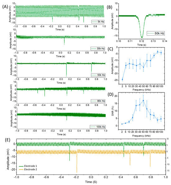 The sensing response from zoospores passing the electrodes, carried in a flow. (A) The recorded real-time signal at different AC frequencies. The frequencies presented here are 5 kHz, 30 kHz, 50 kHz, 80 kHz, and 100 kHz from top to bottom. (B) A zoomed version of the response recorded at 50 kHz. (C,D) The statistical analyses of the signal amplitude and signal-to-noise ratio at different frequencies. (E) The signal from the two different pairs of electrodes, 1 mm apart in the flow direction.