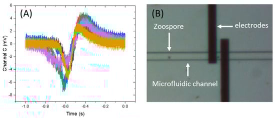 (A) Overlap view of sensing signal received from 6 individual zoospores using Tier 2 sensor. Different lines are different individual zoospores. (B) Microscope image showing zoospore swimming inside the channel.