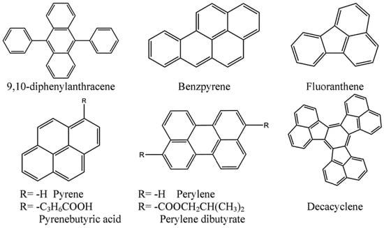In PAHs, except for some containing nitro or carbonyl structures, almost all PAHs have strong and stable PL characteristics. These molecules have a PL lifetime of up to 200 ns, which is easily quenched by oxygen. In particular, pyrene and its derivatives have become the first generation of oxygen photochemical sensing compounds. At ambient temperature, they also show good oxygen sensitivity and low temperature absorption coefficients. However, due to the lack of good solubility in polymers, oxygen sensors based on pyrene are prone to the problem of luminescent molecule aggregation [18]. To overcome these shortcomings, functional side chains can be chemically modified for pyrene derivatives [19]. Pyranobutyric acid is a pyrene derivative with good water solubility, with its maximum absorption peak at 355 nm and maximum monomer emission peak at 396 nm, and a PL lifetime of 200 ns. This material can be fixed on glass by DMF solution treatment and used for oxygen sensing. Using similar strategies, researchers have developed quenching-type oxygen sensors made from a combination of various PAHs and polymers, with the 1-pyridinebutanoic acid sensor showing the best performance parameters such as sensitivity, response time, and reproducibility. The chemical structures of some common oxygen-sensitive PAHs are shown in Figure 1. Due to the significant influence of humidity on the oxygen sensing results of PAHs, these materials are suitable for sensing oxygen in non-water samples.
