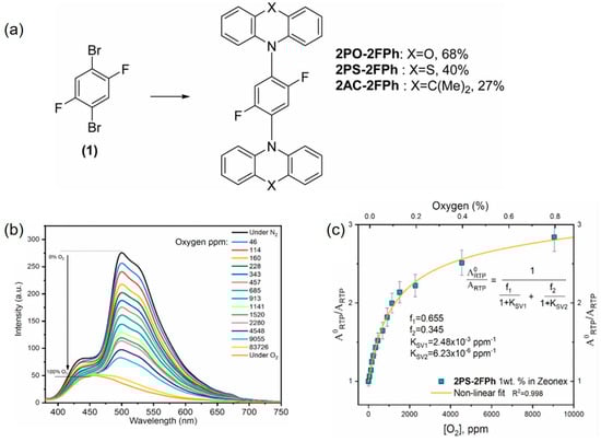 (a) Synthesis of 2,5-disubstituted-1,4-phenylene derivatives; (b) RTP spectra of 2PS-2FPh; (c) Stern-Volmer plots for 1% solid solution of 2PS-2FPh in Zeonex recorded at the different concentrations of oxygen in the atmosphere of the sample [26].