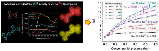 - Di, L.; Xia, Z.Q.; Wang, H.H.; Xing, Y.; Yang, Z.X. Switchable and Adjustable Aie Activity of Pt(II) Complexes Achieving Swift-Responding and Highly Sensitive Oxygen Sensing. Sens. Actuators B-Chem. 2021, 326, 128987. [Google Scholar] [CrossRef]