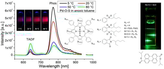 Zach et al. [42] achieved the first dual sensing of oxygen and temperature using a single emitter. As shown in Figure 6, the team used a four-step synthetic method using a template to prepare highly electron-deficient Pt(II) and Pd(II) benzoporphyrin complexes containing alkylsulfone groups. In solution and polymer matrices, these complexes can produce highly efficient TADF at high temperatures due to their small singlet-triplet energy gap, which meets the requirements for optical oxygen sensing. In addition, their emission intensity is proportional to the temperature, so that dual sensing of oxygen and temperature can be based on a single emitter. In dual sensing, temperature information is obtained from the TADF-to-phosphorescence ratio, and oxygen concentration is determined by phosphorescence or TADF decay time.
