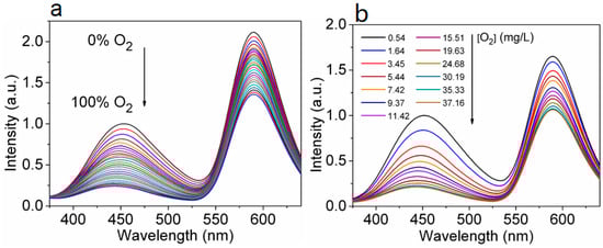 Molecular oxygen is a typical quencher of fluorescence (FL) and phosphorescence. The vast majority of optical oxygen sensing methods are realized based on the principle of FL dynamic quenching including gaseous oxygen and dissolved oxygen [2,3,4]. Therefore, when selecting oxygen sensing probes, in addition to meeting the requirements of having good photobleaching resistance and an appropriate emission wavelength, the sensing material should also possess a longer FL lifetime and a larger specific surface area to enhance the collision probability between the luminescent material and molecular oxygen and maximize the optical quenching ability of oxygen molecules. Most optical oxygen sensors are based on the dynamic quenching between triplet oxygen molecules and the excited state of the sensing material. Since this process is a photophysical rather than a photochemical process, it is completely reversible. In dynamic quenching, the absorption behavior of the material is not affected, while the FL behavior shows a decrease in FL intensity and decay time. The relationship between FL intensity or decay time and oxygen concentration ([O2]) can be reflected by the Stern–Volmer equation, and its simplest form is shown as Equation (1):