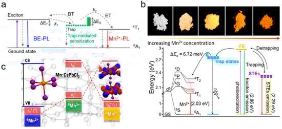 Manganese-doped LHP NCs are one of the most studied and deeply investigated metal-doped LHP materials at present. Similar to traditional semiconductor NCs, the Mn impurity in LHP NCs can also produce the 4T1→6A1 characteristic PL. Liu et al. [71] believe that when the bandgap width (from 1.8 to 3.1 eV, from I− to Cl−) and the energy difference Δ between the 4T1→6A1 transition (2.15 eV) of CsPbX3 NCs and the Mn impurity are greater than zero, effective forward energy transfer can occur between CsPbX3 NCs and the Mn impurity (Figure 8a). However, the host-dopant energy transfer (HDET) rate in LHP NCs is slower than that of II-VI semiconductor NCs [72], and both doped FL and band edge radiation can usually be observed simultaneously. The ratio of the FL intensities of the two is given by Equation (2) [73]: