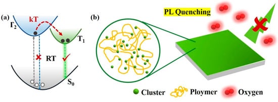 In semiconductor luminescent materials, copper–iodine clusters have a relatively long luminescent lifetime, which makes their three-wire excited states very easy to exchange energy with external materials. Similar to the excited states of copper–iodine clusters, oxygen molecules also exhibit trilinear states under normal conditions, so the sensing of copper–iodine clusters on oxygen can be studied based on this property. In recent years, researchers have found that some copper-based organic complexes with molecular formula [Cu(N-N)(P-P)] or [Cu(N-N)(L)2] (N-N, P-P and L represent nitrogen-containing bidentate ligands, phosphine-containing bidentate ligands and phosphine-containing monodentate ligands, respectively) have oxygen sensing capabilities [111,112,113]. Zhang et al. [113] prepared a sensing film by mixing Cu4I4(PPh3)4 with polystyrene using the intrinsic FL properties of Cu4I4 copper–iodine clusters. They studied the sensing mechanism and the FL pathway is shown in Figure 12. The test results show that the sensor film has a good response to the change in oxygen concentration, and its maximum FL quenching ratio is 5.4. This study opens the application of Cu4I4 copper–iodine clusters in the field of oxygen sensing. The effects of different substituents on the oxygen sensing behavior of Cu(I) complexes were further studied, and it was found that the electron-withdrawing substituents were conducive to increasing the FL lifetime of the complexes, thereby improving the oxygen sensitivity [114]. The machinability of the organic part makes it possible to adjust the sensing performance of the metal–organic complex oxygen-sensitive probe, demonstrating the advantages of the metal–organic complex probe.