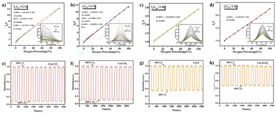 Stern–Volmer plots of different tetranuclear copper iodide hybrid materials towards oxygen sensing (inserted graph: the corresponding emission spectra): (a) CuI-CF3; (b) CuI-CH3; (c) CuI-F; (d) CuI-OCH3, the Stern–Volmer plot of CuI-CF3 was obtained by calculating the emission intensity at 443 nm. Cyclic curve of different tetranuclear copper iodide hybrid materials under alternating N2 and O2 atmosphere within one hour: (e) CuI-CF3; (f) CuI-CH3; (g) CuI-F; (h) CuI-OCH3 [117].