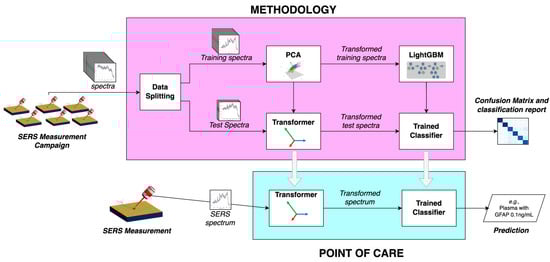 Figure 2; in order to train a machine learning model able to classify SERS spectra of plasma with different GFAP concentrations, we undertook the following: (i) data splitting into training and testing sets; (ii) Principal Component Analysis (PCA) and resulting Transformer, for dimensionality reduction; (iii) LightGBM machine learning framework, and resulting trained classifier. The congregation of these components enables us to receive SERS spectra and train a classification model that is capable of predicting a whole. The outcome is a confusion matrix that enables the evaluation of the performance of the developed methodology. For the implementation of a point of care that enables the evaluation of a new spectrum, the Transformer and Trained Classifier are used to provide a prediction of the type of sample.