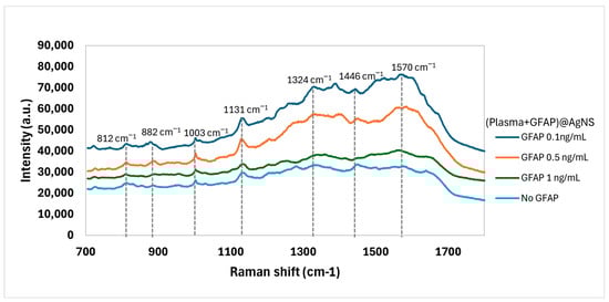 21]. Additionally, different incubation times—15 min, 3 h, and overnight—were evaluated to assess their impact on the SERS spectral profile. The results revealed that, even with the short incubation time of 15 min, with plasma and any of these three GFAP concentrations, it was possible to detect small but notable differences in the SERS spectrum when comparing with plasma alone that was also incubated for 15 min with AgNSs (