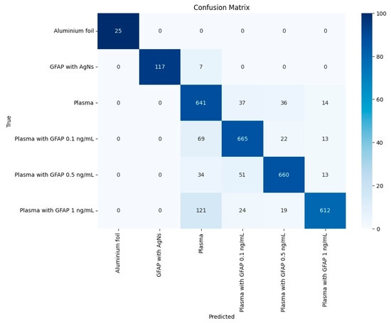 To evaluate the model’s ability to differentiate the classes, we tested two additional scenarios: one with only samples of GFAP + plasma (GFAP 0.1 ng/mL, GFAP 0.5 ng/mL, and GFAP 1.0 ng/mL), which achieved an accuracy of 87%, and another with GFAP 0.1 ng/mL and GFAP 1.0 ng/mL, which achieved an accuracy of 91%, showing that the model is sensitive to the different concentrations of GFAP used in this study.
