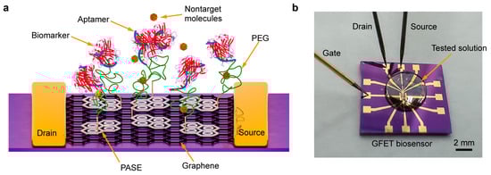 Biosensor development has been aimed at facilitating the creation of devices in the sensitive monitoring of biomarkers within authentic physiological media [25,26,27]. However, physiological media contains numerous biomolecules beyond the intended targets, encompassing metabolites (e.g., glucose and lactate), simple ions (e.g., Na+ and Ca2+) and cells. These nontarget molecules in such solutions tend to adsorb onto the graphene surface, introducing interference with biomarker detection. This interference reduces sensor sensitivity, making it challenging for the biosensor to effectively detect its targets in undiluted physiological media. Consequently, a necessity to investigate the capability of aptamer-based graphene biosensors arises, for sensitive detection of disease biomarkers in undiluted physiological media. To address nonspecific adsorption at graphene interfaces, reagents such as Nafion [28], Tween 20 [29], and, particularly, polyethylene glycol (PEG) [30] are utilized. PEG, recognized for its biocompatibility, enhances the Debye screening length in high ionic strength media, also offering its reliable attachment to device surfaces to reduce nonspecific interactions in physiological media [31,32]. However, these biosensors require FET analysis in PBS (phosphate-buffered saline) or diluted media, limiting their suitability for direct, in situ disease diagnostics under real clinical conditions. Consequently, there arises a need to investigate the capability of aptamer-based graphene biosensors for sensitive monitoring of disease biomarkers in physiological media.