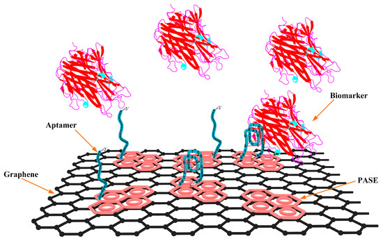 Recently, aptamer-based biosensors have been developed to detect disease biomarkers. Such sensors involve using antibodies or aptamers as specific probes to recognize target molecules [13,14]. In particular, aptamer-based field-effect transistors configure from semiconductor materials [15], carbon nanotubes [16] and graphene [17] have received significant attention for biosensing applications. Among these materials, graphene is an ideal candidate as the conducting channel for biosensors, due to the unique characteristics such as high carrier mobility, low intrinsic noise and sensitive to its surface charge distribution [18,19,20]. Since the first investigation of biomarker detection using the graphene-based field-effect transistor (GFET) [21], such devices have demonstrated high sensitivity and specificity in label-free detection of various analytes, including ions, enzymes, small molecules, DNA, and proteins [22,23,24].