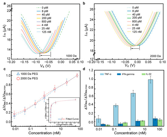 The detection capability of the biosensor was first investigated in PBS using the biosensor modified with 1000 Da and 2000 Da PEG. TNF-α, a cytokine produced by white blood cells, plays a key role in regulating immune and inflammatory responses [33,34,35]. Studies indicate that abnormal concentrations of TNF-α suggest its critical role in the molecular pathogenesis of cervical carcinoma and offer a potential biomarker for the early diagnosis and therapy of the disease [36,37,38]. The sensing mechanism relies on the structural transformation of the aptamer upon binding with proteins (Figure 3). This guanine-rich oligonucleotide sequence can adopt a compact and stable G-quadruplex structure, formed by two guanine tetrads originating from its loop region. Hence, TNF-α protein (isoelectric points is arounds 6.0), negatively charged in 1 × PBS, closely approached the graphene through binding with the aptamer. This interaction altered the conductivity of the graphene, thereby inducing n-type doping in graphene and resulting in a negative shift in the transfer characteristic curve. As shown in Figure 4a,b, the transfer characteristic curves continuously shifted towards the negative side of the X-axis as the concentration of TNF-α increased from 0.008 to 125 nM. For the biosensor modified with 1000 Da PEG, ΔVDirac shifted from −58 to −97 mV, and the value of ΔVDirac decreased from −1 to −31 mV for the biosensor modified with 2000 Da PEG.