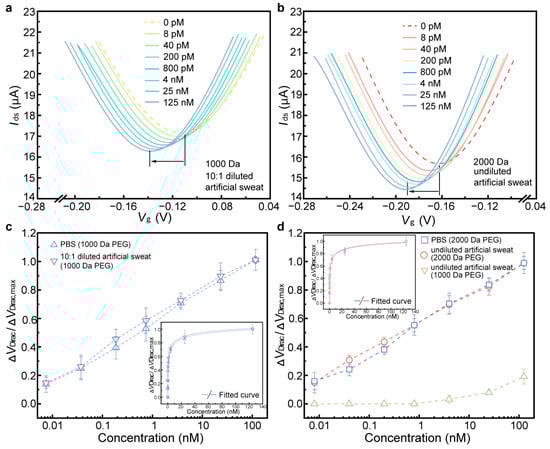 Biomarker detection in artificial sweat. Transfer characteristic curves of sensing responses to different TNF-α concentrations modified with 1000 Da PEG in 10× times diluted artificial sweat (a) and modified with 2000 Da PEG in undiluted artificial sweat (b). (c) ΔVDirac/ΔVDirac,max as a function of TNF-α concentrations using the biosensor modified with 1000 and 2000 Da PEG in 10× times diluted artificial sweat (c) and undiluted artificial sweat (d), respectively. The inset shows fitted curves of sensing responses.