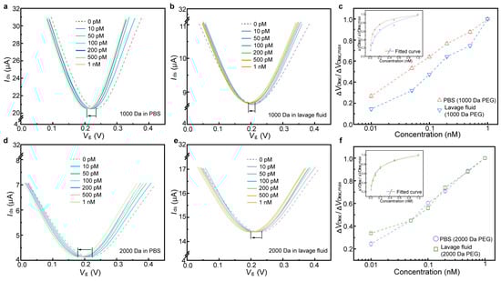 Sensing response of the biosensor to the IL-6 biomarker. Transfer characteristic curves of the biosensor modified with 1000 Da PEG in response to different IL-6 concentrations in PBS (a) and undiluted perfusion media (b). (c) ΔVDirac/ΔVDirac,max as a function of IL-6 concentrations in PBS and undiluted perfusion media (1000 Da PEG). The inset shows fitted curves of sensing responses. (d) Transfer characteristic curves of the biosensor modified with 2000 Da PEG in response to different IL-6 concentrations in PBS (d) and undiluted perfusion media (e). (f) ΔVDirac/ΔVDirac,max as a function of IL-6 concentrations in PBS and undiluted perfusion media (2000 Da PEG). The inset shows fitted curves of sensing responses.