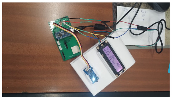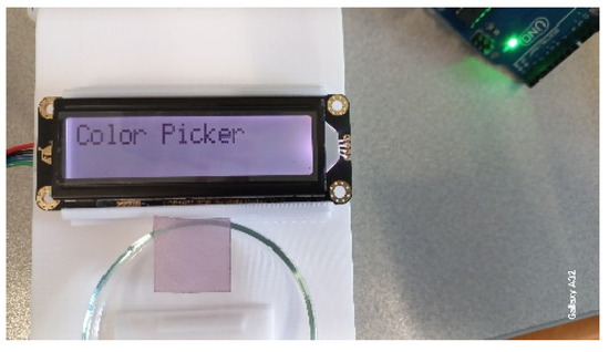The Color Picker System is a user-friendly device that is able to reproduce the color detected by the Grove I2C TCS34725 color sensor (SeedStudio, Shenzhen, China) in the backlight of an Grove LCD RGB backlight Display (SeedStudio, Shenzhen, China). Its objective is the colorimetric quantification of the analyte of interest, which permits sample analysis without the need for bulky instruments. The set-up of the Color Picker Systems is depicted in Figure 1. It includes the TCS34725 color sensor, an I2C RGB display, and an Arduino Nano microcontroller assembled on a board.
