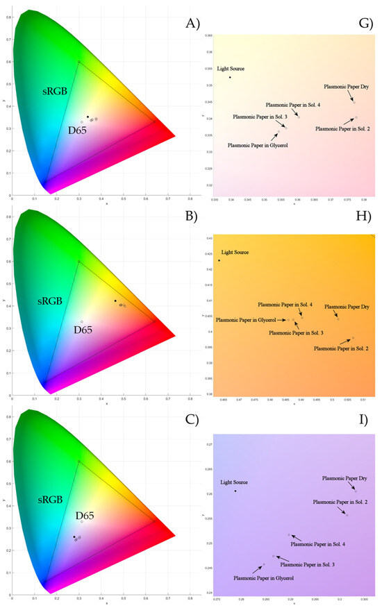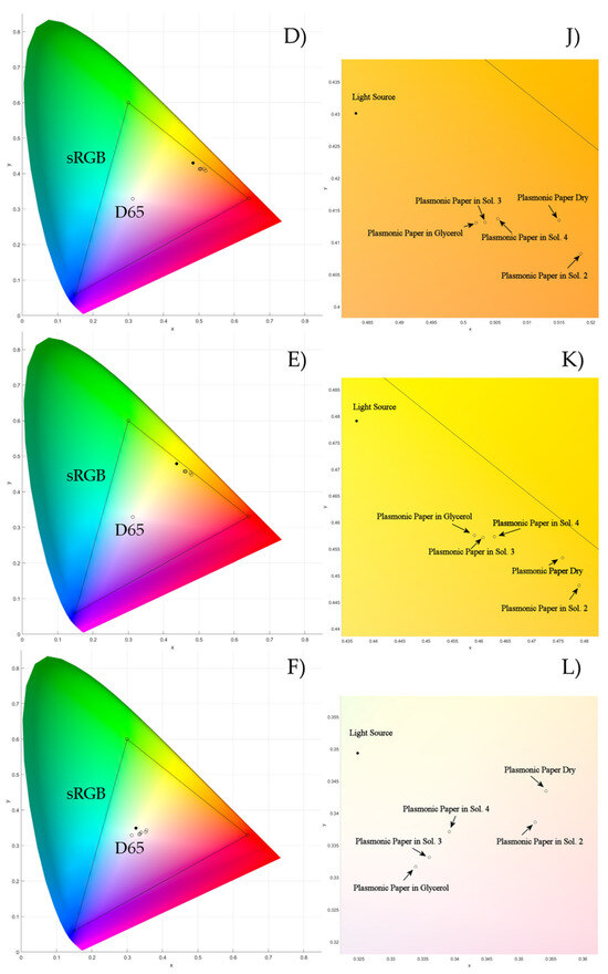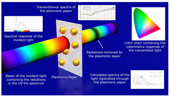 In Figure 3, the plasmonic paper is depicted along with the inputs (spectrum of the incident light and transmittance spectra of the plasmonic paper) and the outputs (chromaticity diagram with the chromatic response of the incident and transmitted light and the calculated spectra of the transmitted light along with their color representations). The beam of the incident light is represented with the full UV-Vis spectrum, whereas the dark band in the transmitted light represents the radiation removed by the plasmonic paper.