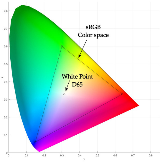 The color gamut that can be represented in the sRGB color space is the color triangle defined by the ITU-R BT.709 primaries [47]. The white point of the sRGB color space is reliant on the standard CIE D65 illuminant [48], which specifies natural daylight with an overcast sky or a mix of lights arising when direct sunlight and light from the remaining sky fall on a horizontal surface. At the same time, the standard CIE D65 illuminant corresponds to a black-body radiator at a correlated color temperature (CCT) of 6500 K [49,50]. Table 3 displays the coordinate in the xy color space for the ITU-R BT.709 primaries and D65 illuminant [51,52]. In Figure 4, the triangle representing the sRGB color space is represented along with the white point into the chromaticity diagram (CIE standard D65).