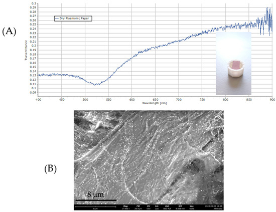 The optical properties of the plasmonic paper were initially characterized using transmittance spectroscopy, while its morphological features were examined via scanning electron microscopy (SEM). The transmittance spectrum depicted in Figure 6A exhibits a prominent dip centered at 525 nm, indicative of localized surface plasmon resonance. The SEM image in Figure 6B shows a uniform distribution of gold nanoparticles within the three-dimensional network of the paper’s cellulosic fibers, with no visible signs of nanoparticle aggregation.