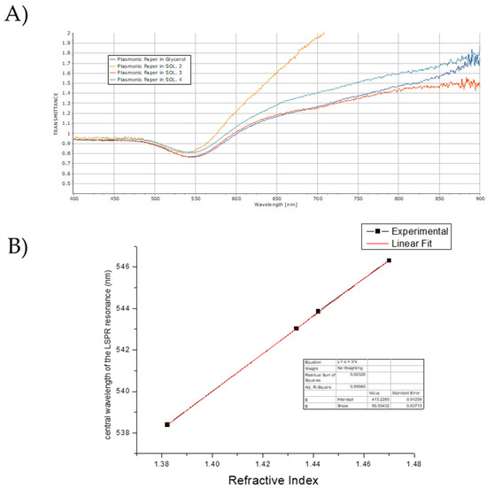 By plotting the position of the transmittance dip versus the RI of the medium embedding the plasmonic paper, it is possible to observe a red shift in the transmittance, in accordance with the Mie theory (Figure 7B). Also, the graph shows that a reasonably good linear fit could have been reached for the dependence of the transmittance position from the calculated RI values.