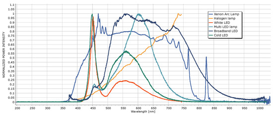 Currently, most LEDs use phosphor conversion technology (phosphor-converted LEDs or pcLED) [61]. White light is generated by combining a portion of the blue light emitted directly from an LED with a Gallium Nitride (GaN) substrate (smaller peak at 451 nm) with the light converted to yellow emitted by the phosphors (broad peak at 567 nm). These phosphors can be located on the LED’s emitting surface, within the encapsulant, or away from the LED (remote phosphors). In the case of the Cold and White LEDs, the peak centered at smaller wavelengths presents the highest value for the intensity, whereas the intensity of that peak is notably reduced in the case of the Broadband and Multi-LED lamps. The peak centered at larger wavelengths in the spectra of the Broadband LED is wider compared to the peaks of the other LED lamps. The spectrum of the Halogen lamp is characterized by the absence of peaks, while the power intensity grows for increasing wavelengths. In contrast, the Xenon Arc lamp exhibits a broadband spectrum.