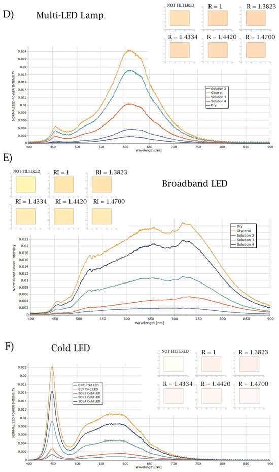 The illumination with lamps originating different power spectra produces different chromatic responses in the same sample. In light of that, we considered different light sources to simulate the effects of the incident light on the color recognition process. Also, in order to evaluate the sensing properties of the method, the effect of the illuminant was evaluated in combination with the effect of the dielectric environment, calculating the spectra of the transmitted light at different RIs for each type of light source. In Figure 8, the normalized power intensity spectra of the different light sources before crossing the plasmonic papers embedded in the different mixtures are reported.