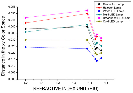 With the aim to transfer the data obtained from the simulation study into real-world applications, it should be considered that a light source with the potential to be integrated into the Color Picker System must be able to produce the greatest differences in the output signal for small differences in the detected colors. On this basis, an optimized light source produces the largest distances between two consecutive points on the color chart representing the chromatic response of the filtered light.